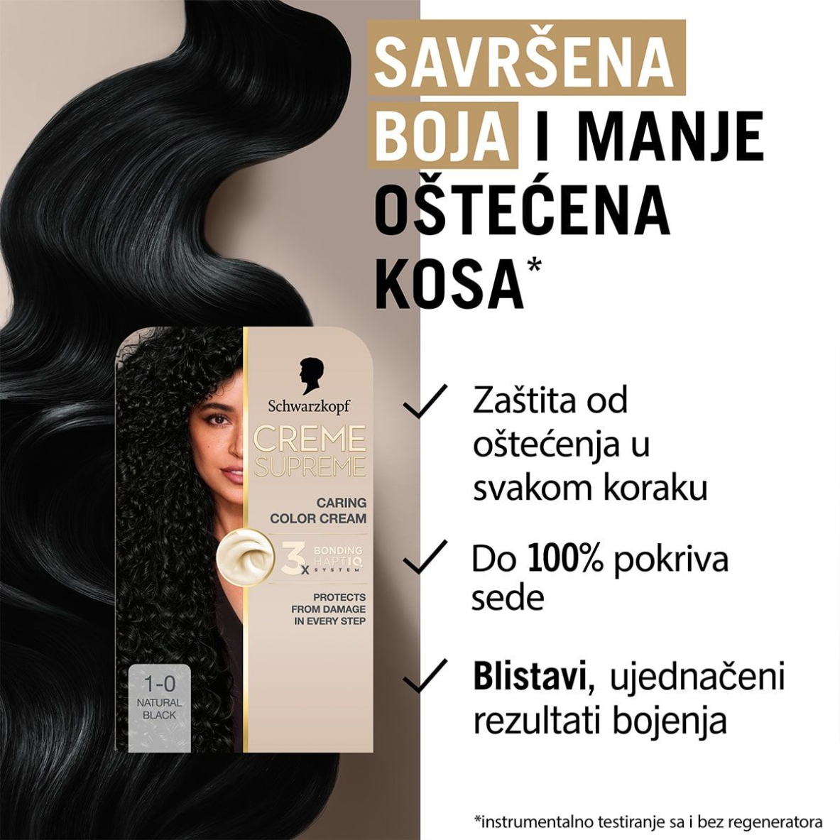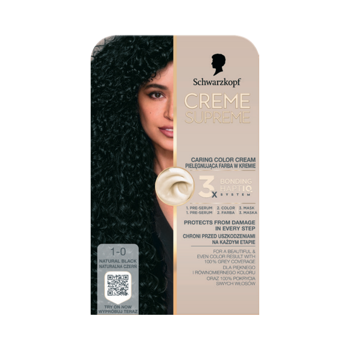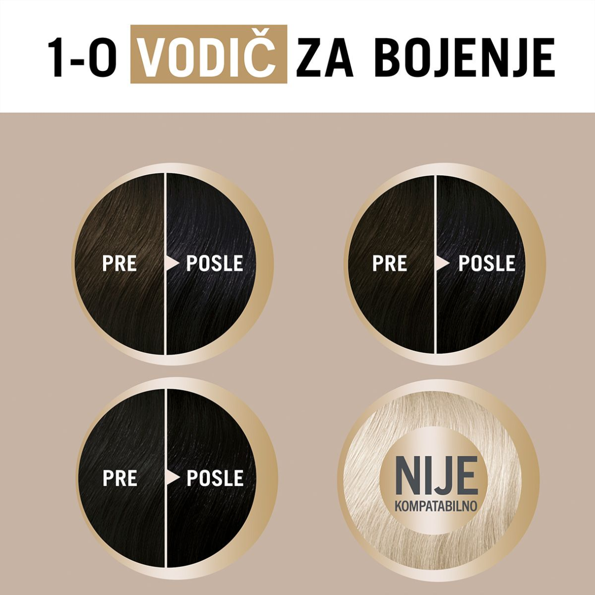 Negujuća trajna boja sa 3-korak bonding ritualom (pre-serum → boja → maska) koji pomaže jačanju veza unutar vlasi i pruža ujednačen, dubok hladno crni rezultat sa sjajem i do 100% prekrivanja sede kose. PETA-odobreno (globalna politika testiranja na životinjama), veganska formulacija (bez sastojaka životinjskog porekla) i FSC odobreno pakovanje.